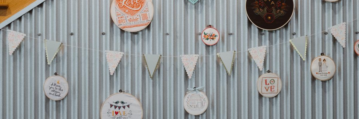 I decided that my contribution would be embroidered and cross-stitched designs to hang behind our sweetheart table. Our venue had a tin wall that was the perfect spot to showcase the finished pieces. I’d been working on this installation pretty steadily since January. While I didn’t get to finish ALL the pieces I wanted, I was able to get a decent-sized collection for the wall. All photos below are from our photographer, You Are My True.