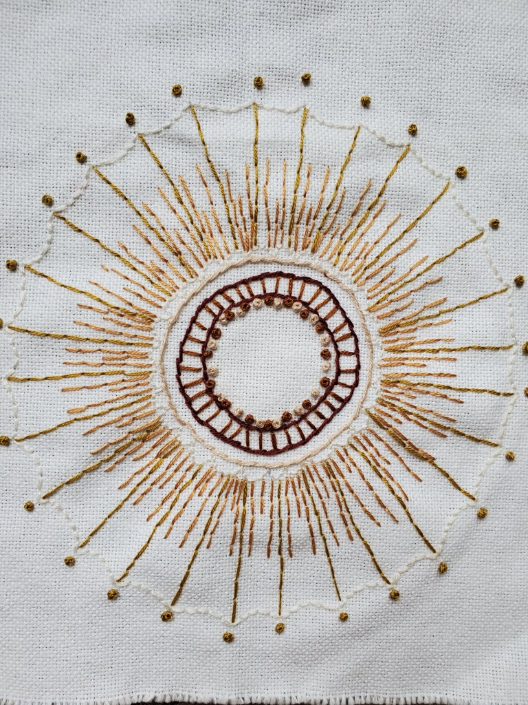 Liked your sun. I couldn’t do it, cross stitch yes where I can count boxes, but you are good at the embroidery. If you enjoy it it doesn’t have 2 b perfect…