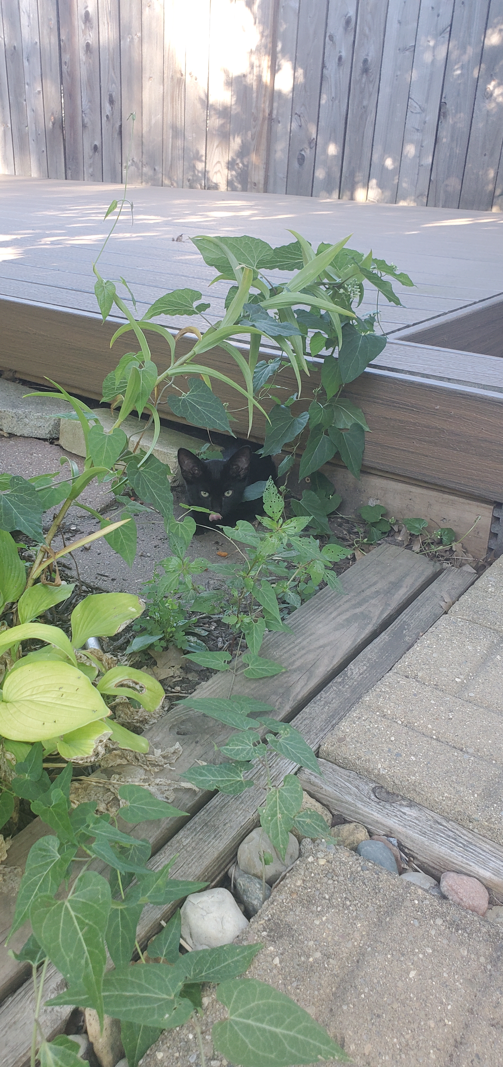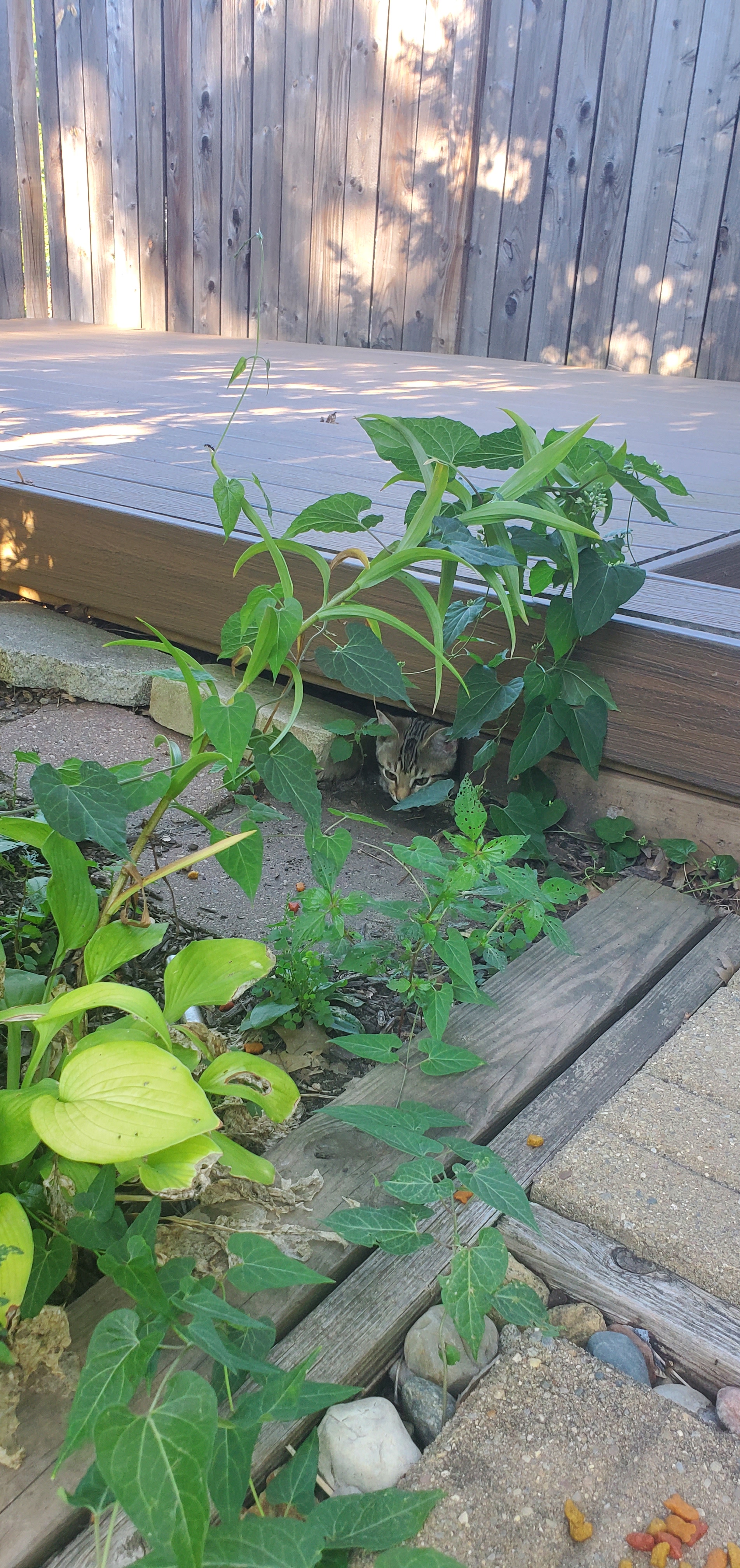 The kittens were gone when I returned a week later, but made a brief cameo several weeks later. As I sat in my office, I saw a gaggle of kittens crossing the street together and crawling under the deck. But since I wasn’t as consistent with the Meow Mix feedings, I didn’t see them again for weeks. I’d put out a bowl of food and while the food would be gone the next day, there wasn’t a trace of the kittens.