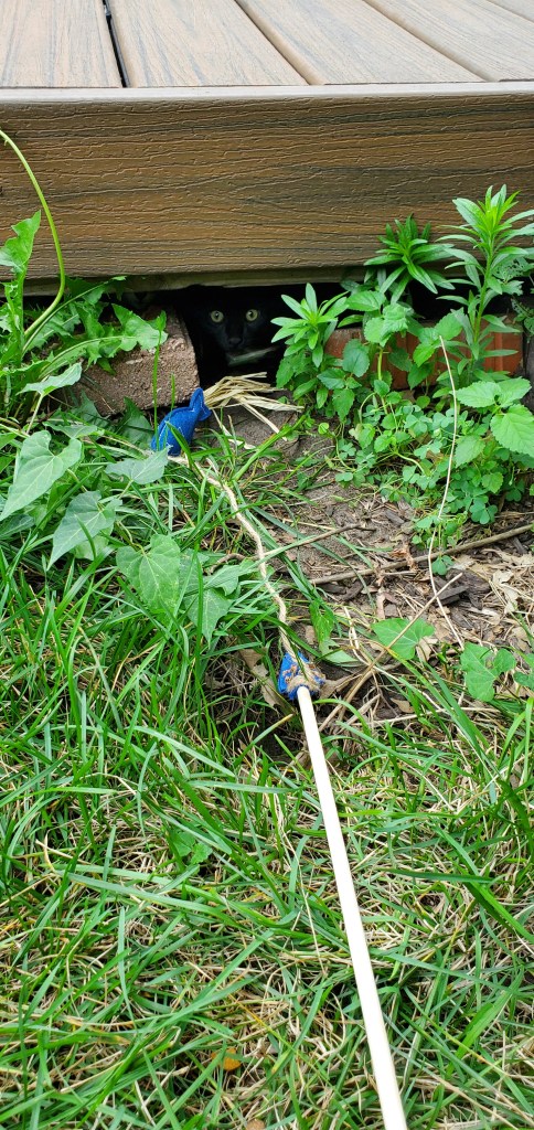 As the kittens grow older, we consider their futures. We’ve purchased cat toys to lure them from under the deck. I feed them several times a day, singing to them as I fill their bowl. I tell them the house rules (you can stay as long as you want, please don’t eat the chipmunks) that they apparently ignore, since I haven’t seen the chipmunks in over a week. “What’s new, kitty cats?” I sing the Tom Jones tune as I fill their bowls, sanitized to be SFK (Safe for Kittens). We are trying not to get attached to them since we don’t know whether our geriatric dog will let us adopt any, but I just told you that we named two of them and that I sing to them so…yeah. Clearly we are failing miserably at this.