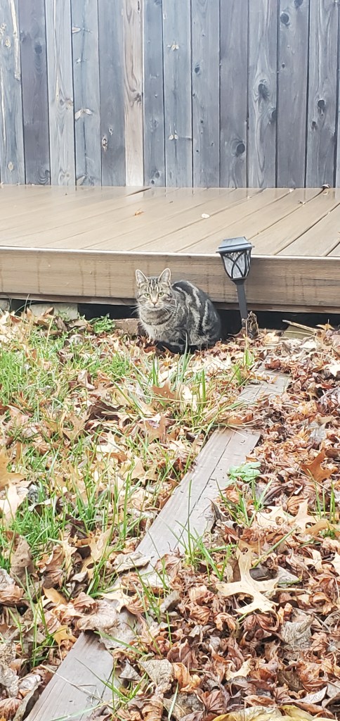 I haven’t seen my little Jiji in awhile – I hope she’s safe, warm, and well-fed. One of her litter mates has been stopping by every day though. We call her Goose. She’s just as skittish as the rest of her siblings were, but she’s finally getting to a point where she doesn’t run under the deck when she sees me.