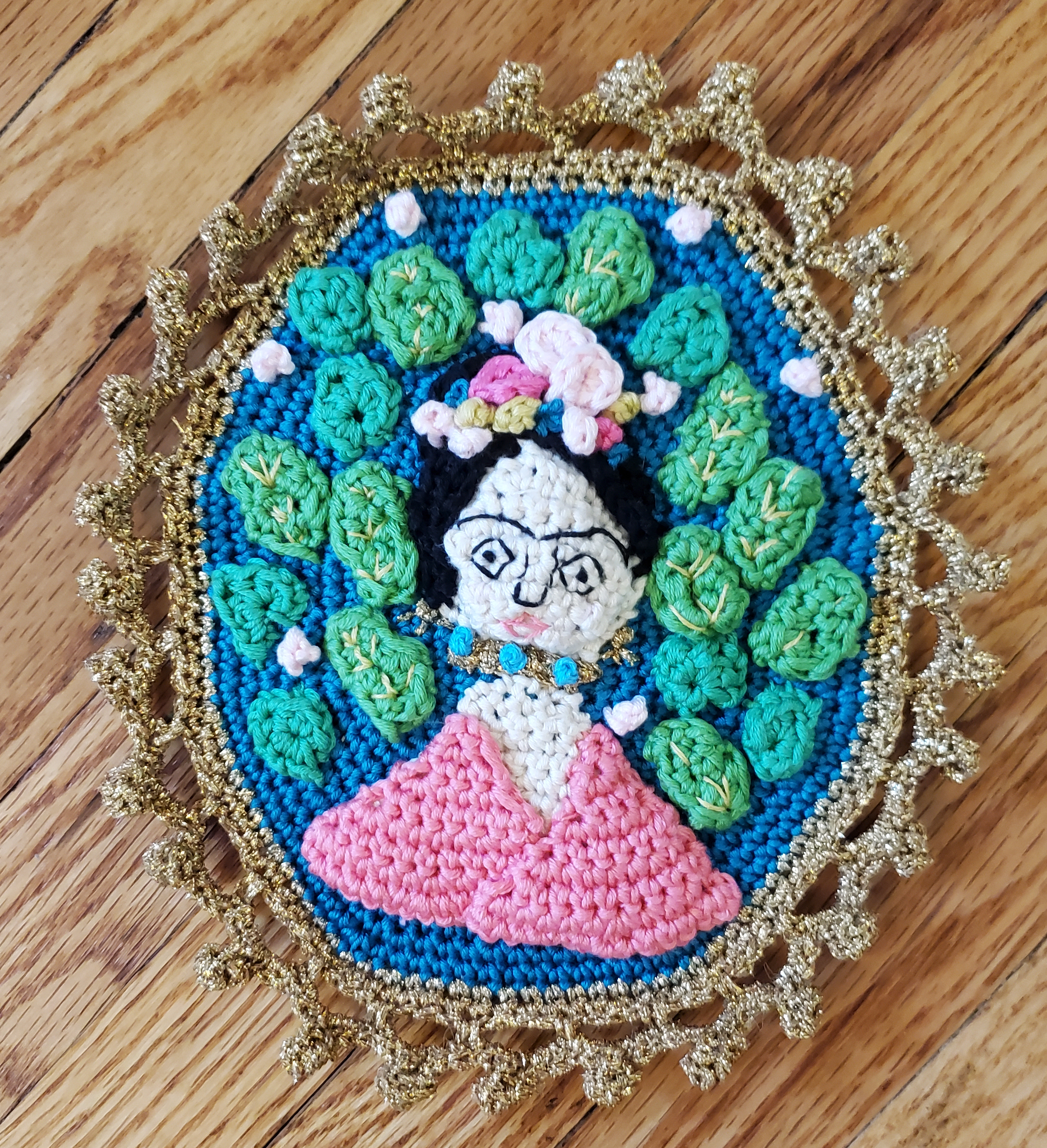 This is a cameo of Frida Kahlo from a 2016 Little Box of Crochet project. It’s been in my stash for all these years because when I initially received it, I didn’t think I had the crochet skills to finish this project. (And maybe I still don’t? Hah!) It was an interesting project but definitely tedious. I was supposed to trace Frida’s face and eyebrows onto the cameo first before stitching them, but I got impatient and went freehand and…this is the result. I’m glad I finished it, but I can’t say I’m very happy with it. Poor Frida just looks pretty wonky here.