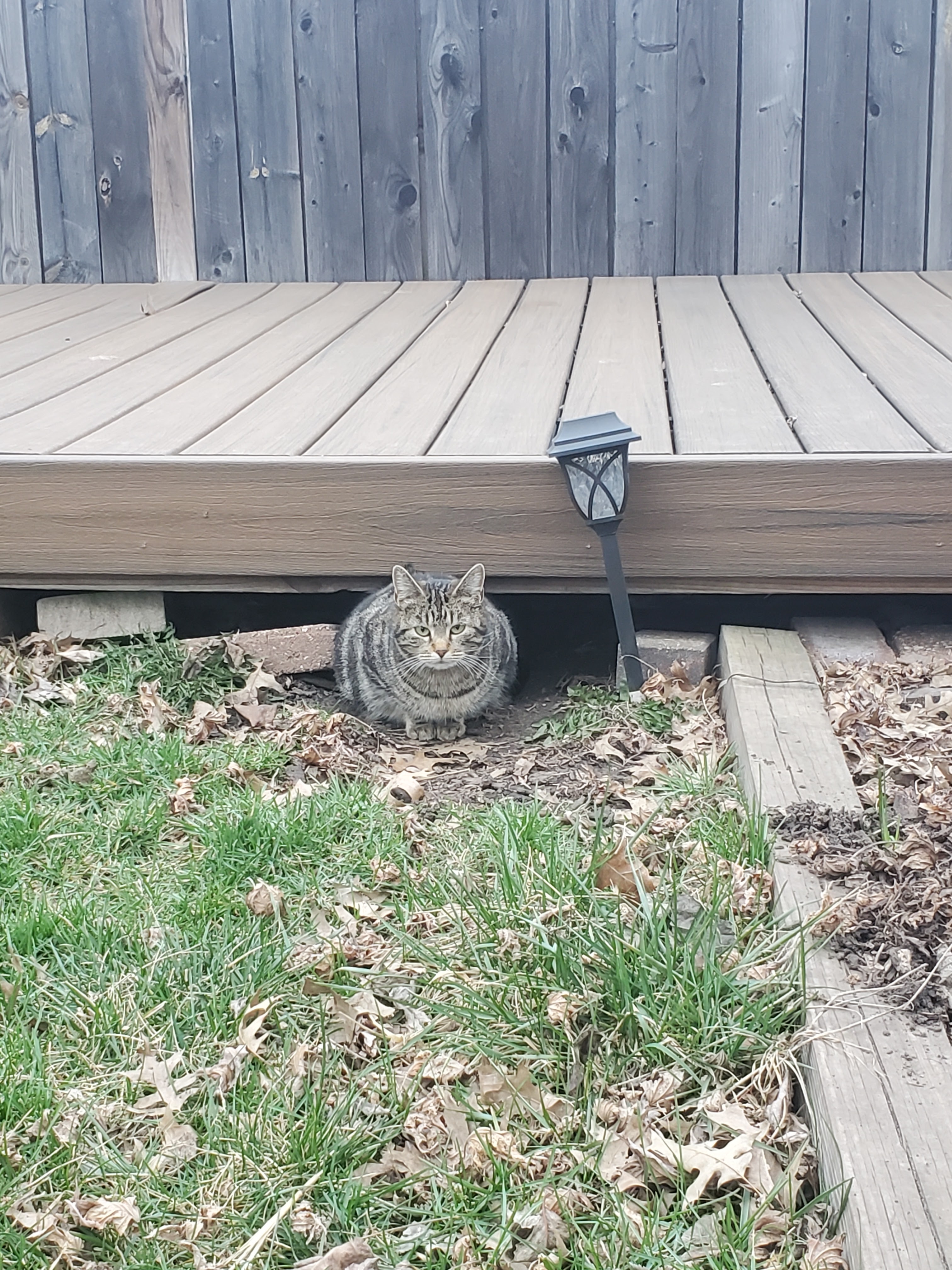 I’ve been feeding Goose, a sweet feral cat, for awhile. We’re pretty sure she was part of the original litter of kittens who started living under our deck last summer. The kittens disappeared around August. Of the original four, just Goose and Jiji still visit us. They’re both undoubtedly feral, as we missed the window of socialization with them. But being able to see their personalities develop has been a joy. Jiji is extremely playful – he loves playing with the cat toys we buy for him. Goosie is more docile. The most I’ve seen her play is by rolling over on one of the toys.