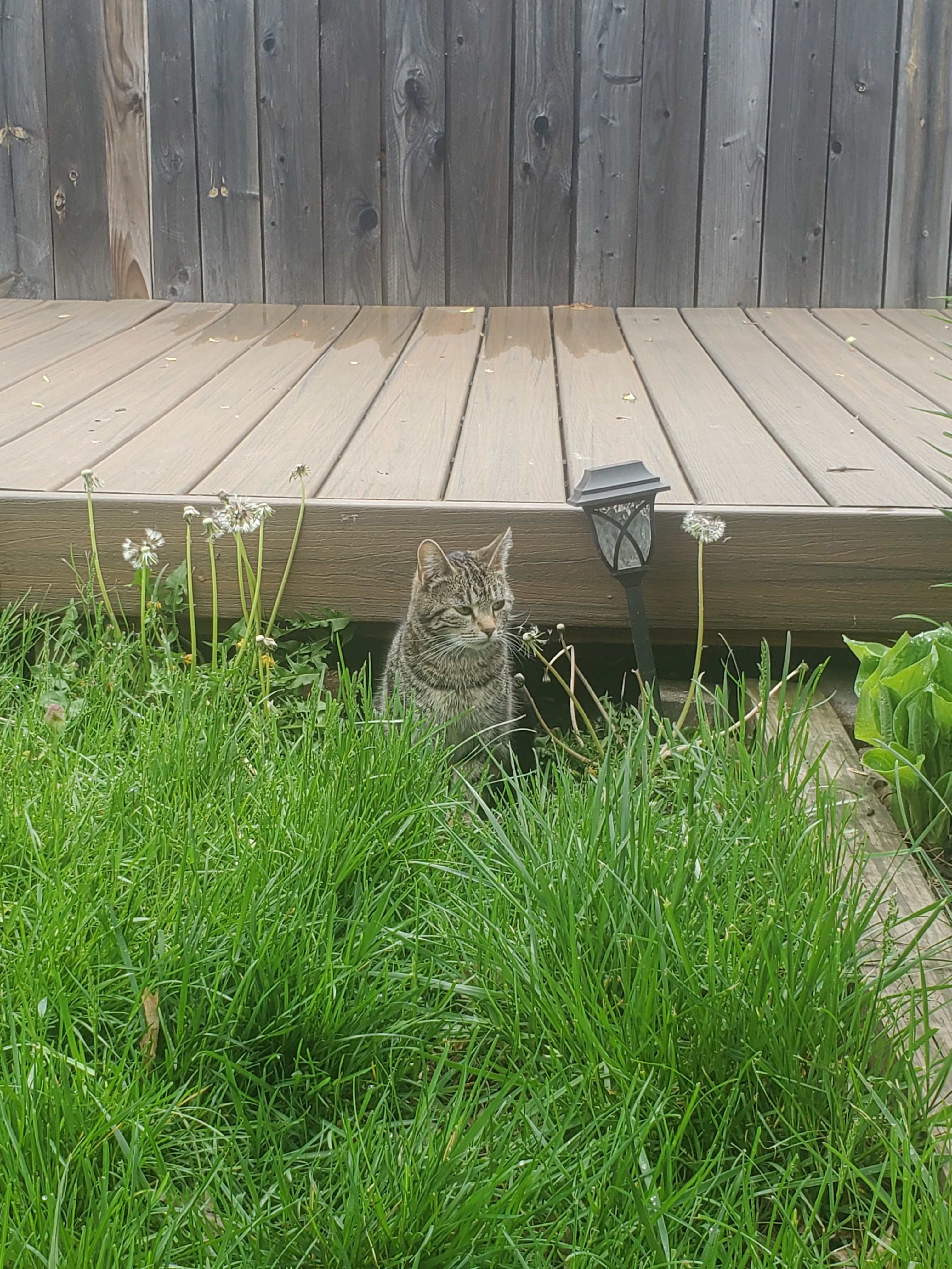 Goosie got chunkier and chunkier, and then disappeared. I don’t think she had her kittens under our deck – I suspect she had them at the other location she stays at. For several weeks we didn’t see her – and then one day, she showed up again, waiting for food. She was noticeably thinner.