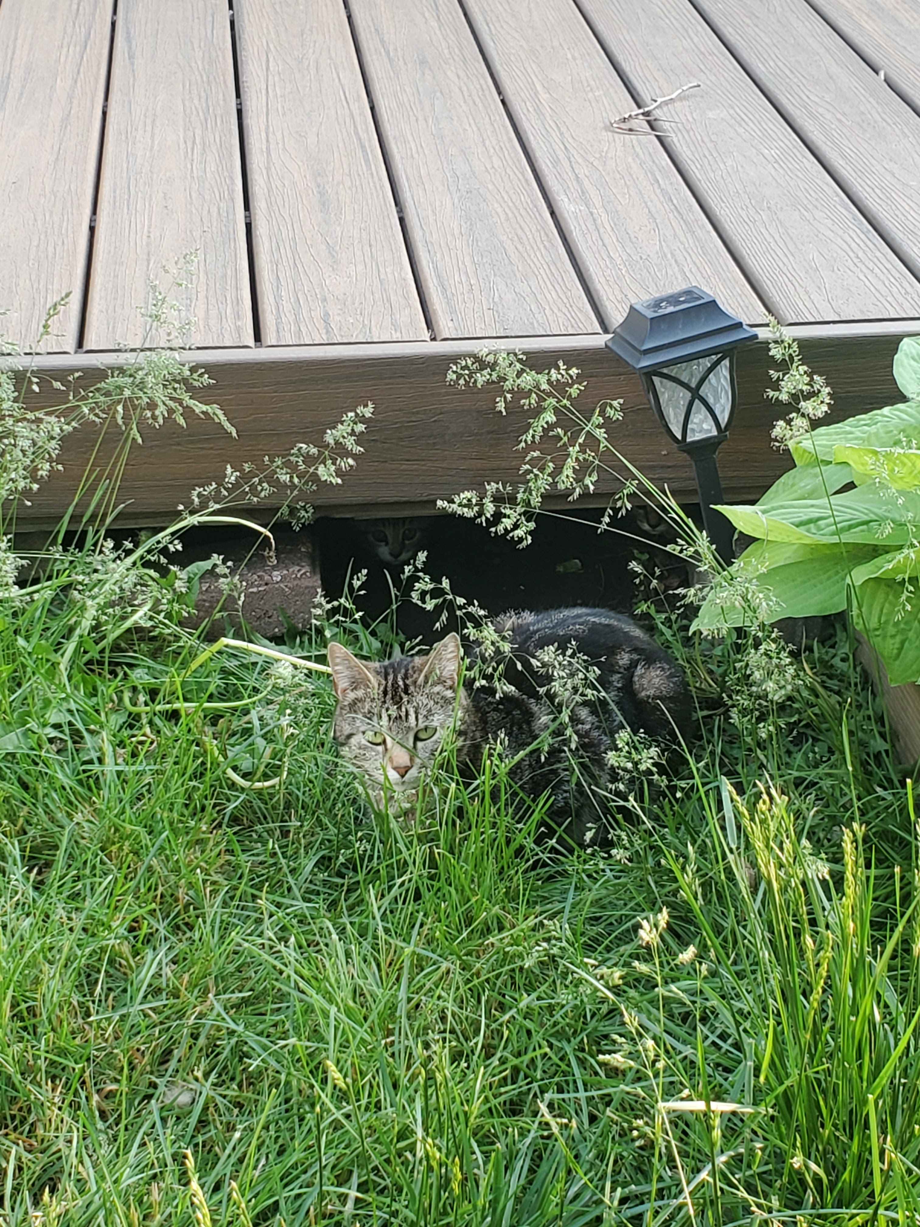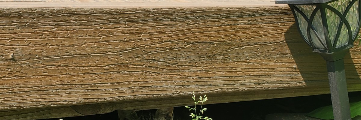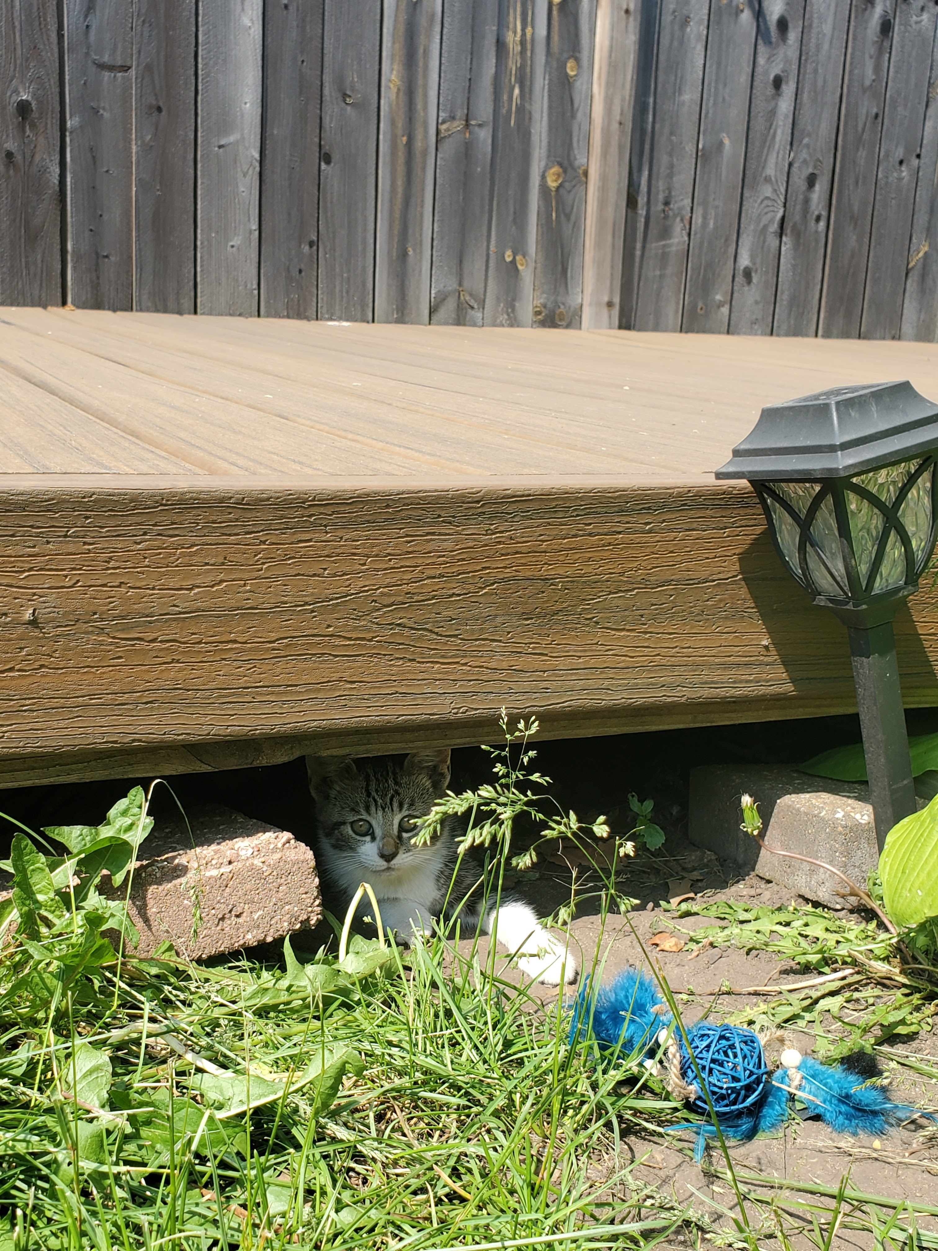 Several days ago, I’d made great progress with the kittens. They were responsive with the fishing pole game and they let me get closer to them. I’d held out some food to them near the deck. I could tell one of them wanted to eat from my hand but got skittish.