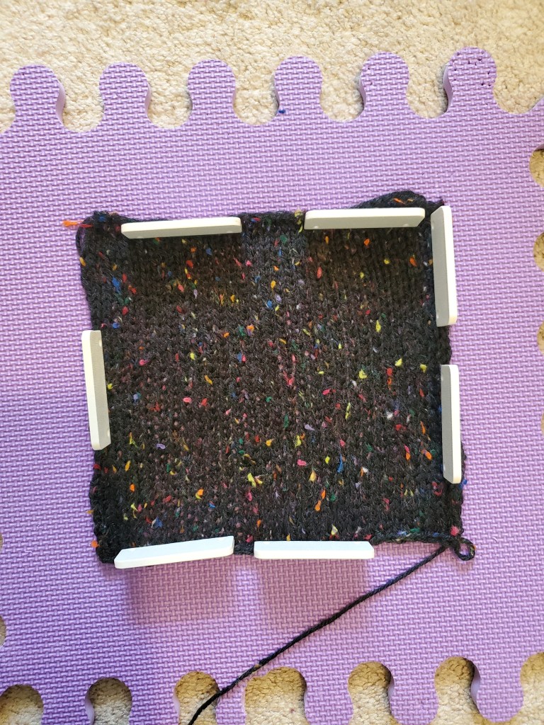 After you complete the swatch, you have to block it – there are a couple of different methods for blocking, but this helps even out the piece and “set” the stitches.