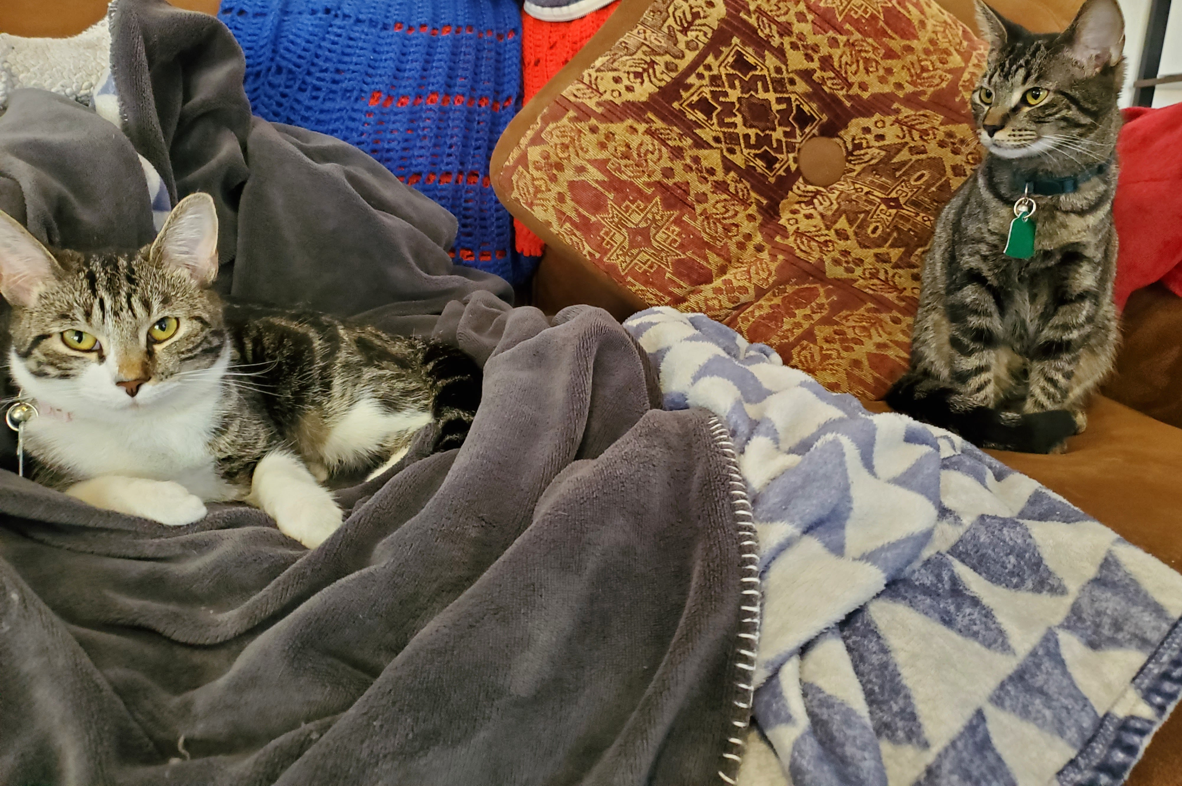 Like I mentioned, we’re at the in-between stage with the pets. The girls pretty much have free reign of the house except for a couple of hours in the evenings or weekends so Apollo can relax. The kittens enjoy cozying up on blankets, dragging all the blankets to the floor, throwing coasters around the house, and eating my plants.