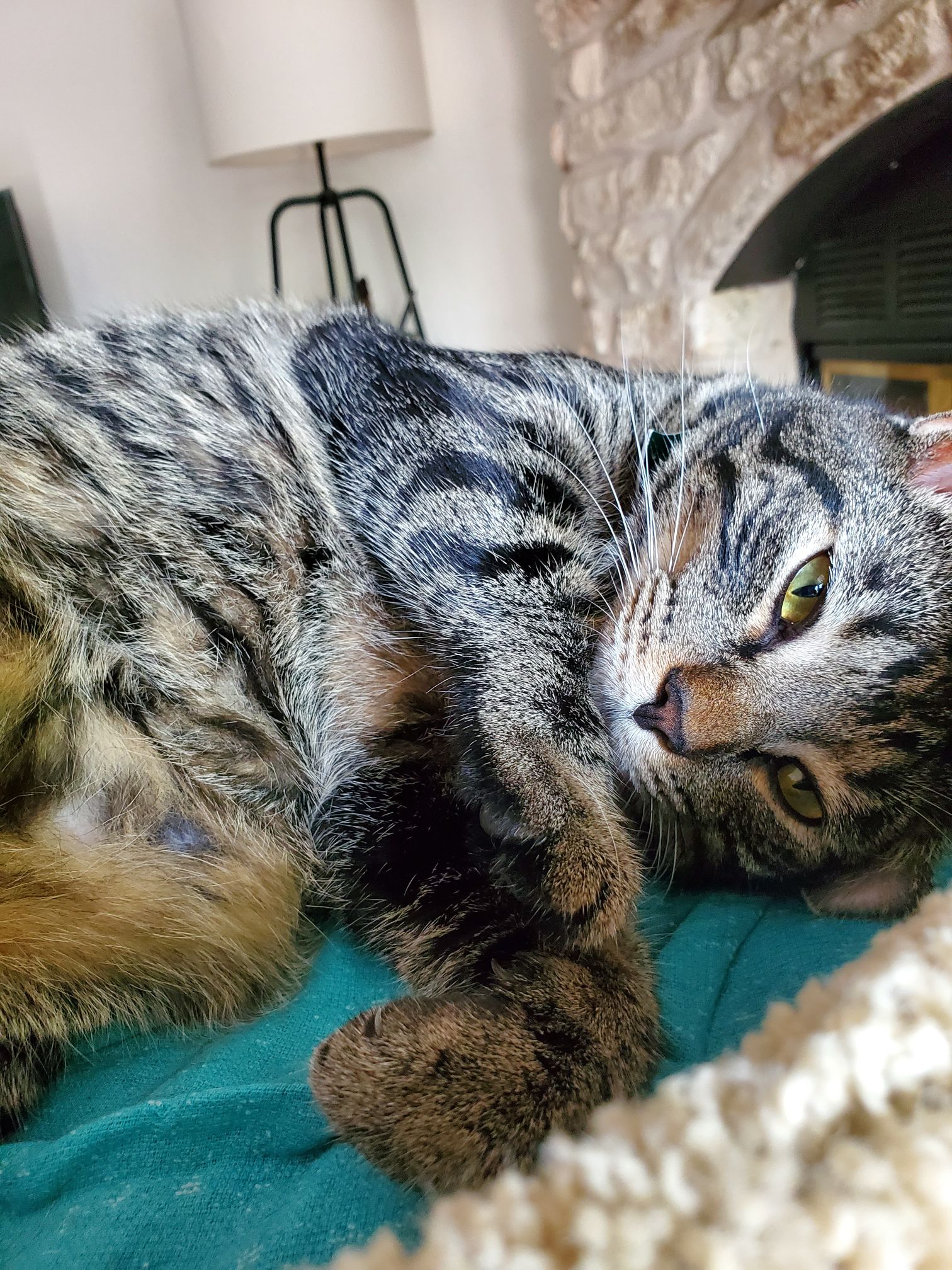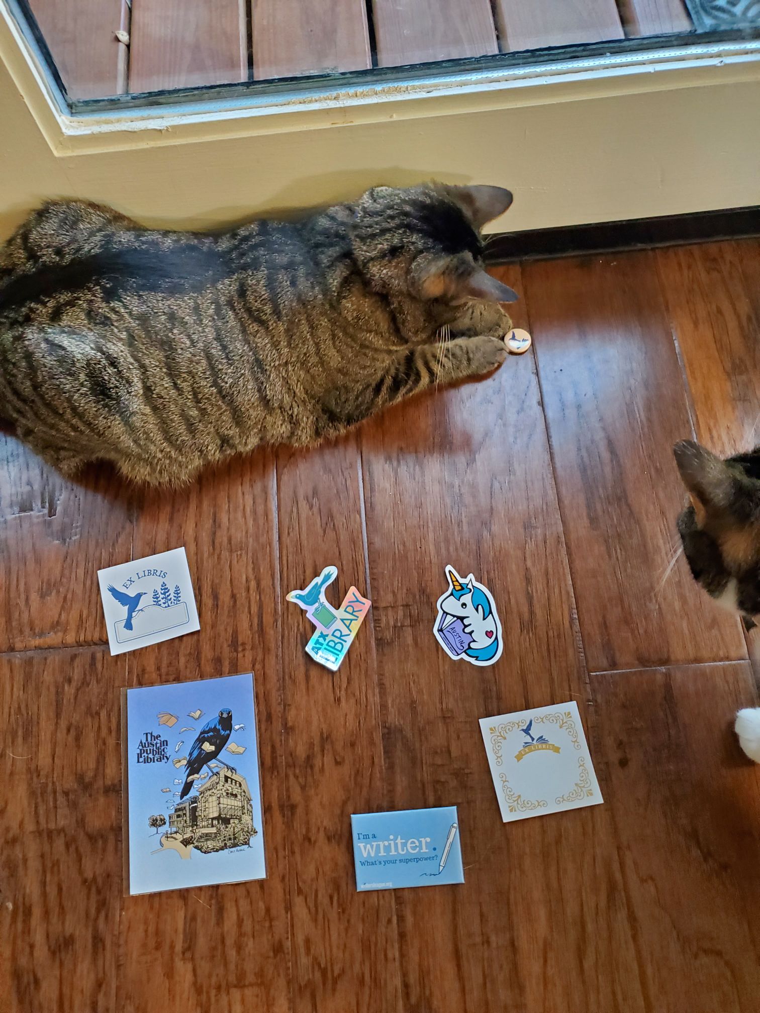 This morning I decided to take a photo of the free stickers and goodies I’d picked up at the Fest, along with my completed book and a postcard that I’d purchased from the Library gift shop. (I really wanted to buy the t-shirt with the grackle print on it, but not for almost $40). Miss Moon Pie decided that she should join me for the photo shoot and mess with the pins.