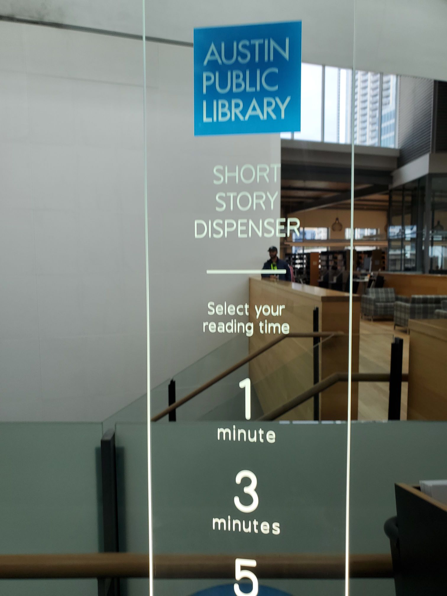 Yesterday was a lot of fun. The Austin Public Library hosted its first annual Greater Austin Book Fest at its central location downtown. The library was renovated right before we moved away, so yesterday was my first chance to visit since its renovation. It’s incredible! There are six floors with an outdoor atrium at the top, which overlooks Town Lake. There’s a short story generator – you tell it what story length you want (1, 3, or 5 minutes) and it prints a short story for you. It even has a gift shop!